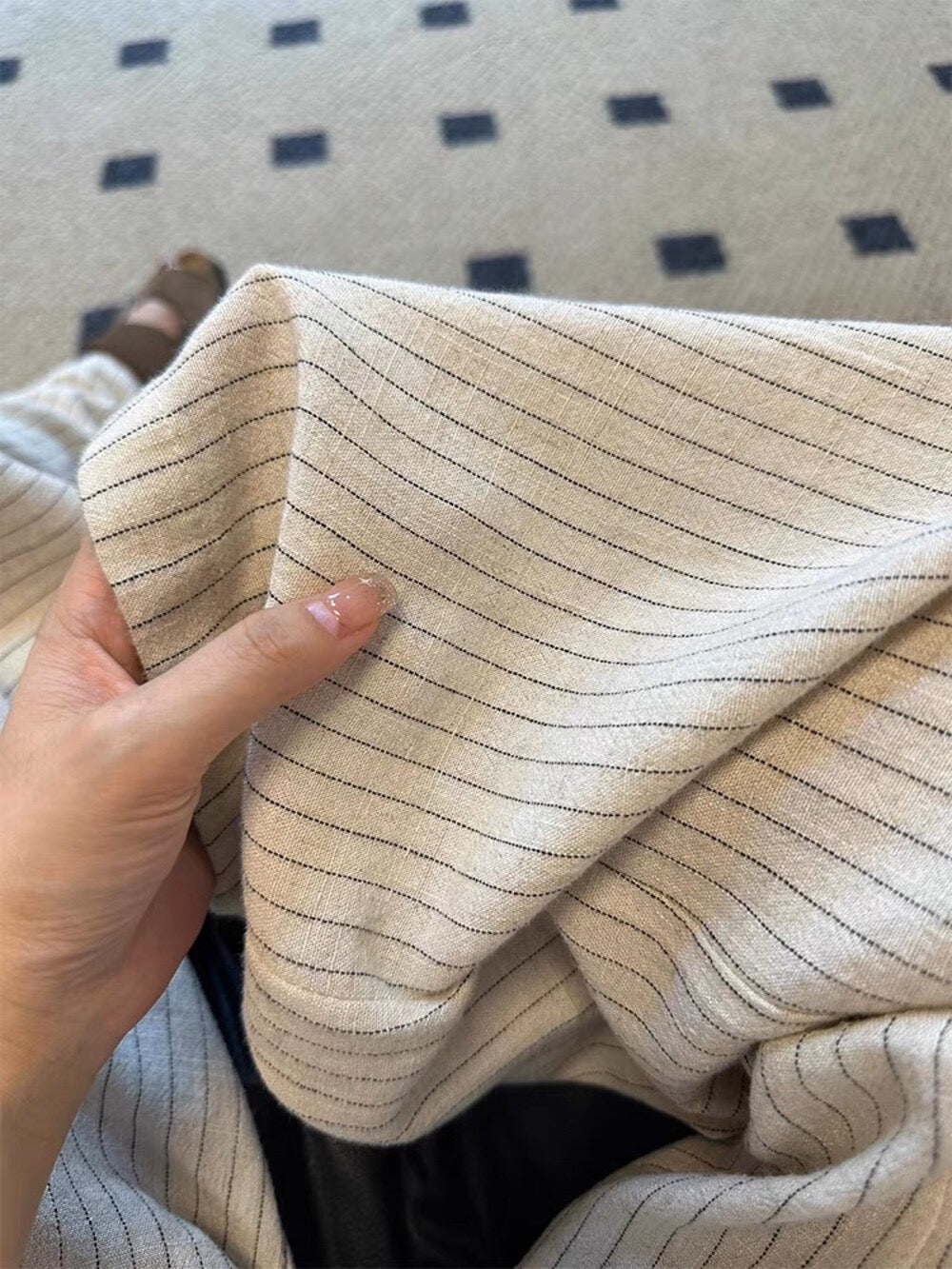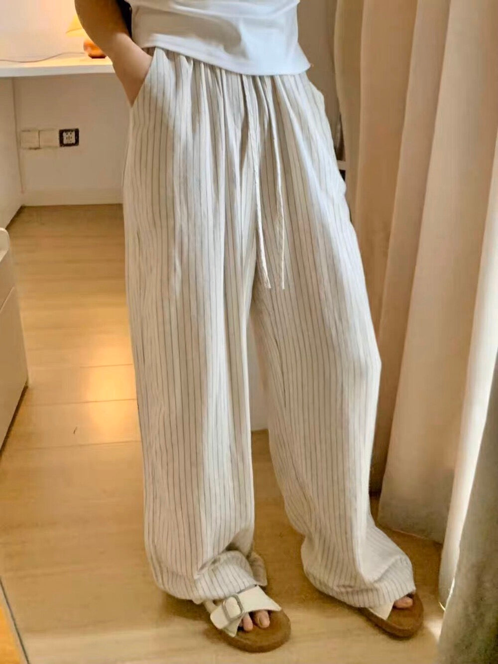 Cotton and linen vertical striped high-waisted elastic waist wide-leg pants